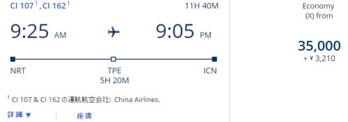 2018年7月現在、日本〜韓国間の必要マイル数は、エコノミークラスだと片道7,500マイルになりますが、上記航空会社利用だと、片道7,500マイルで予約できなくなりました。