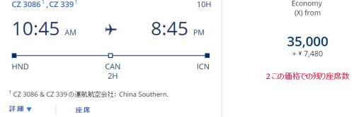 の広州経由も、以前は片道7,500マイルで乗れましたが、現在は片道35,000マイル必要になります。