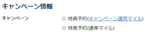 公式サイトで通常通り予約画面を進んでいき、途中「キャンペーン適用マイル」を選択すると、キャンペーン用の少ない必要マイル数で予約することができます。