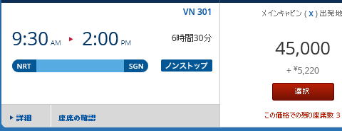 成田〜シェムリアップ間を検索すると、空席がある日は、ベトナム航空(VN)の成田〜ホーチミン〜シェムリアップというルートが表示されます。