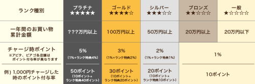 ドンキホーテ公式サイトに掲載されている、Majica特典一覧表です。年間の買い物利用額が100万円を超えると、Majicaチャージ時のポイント付与率が3%に上がります