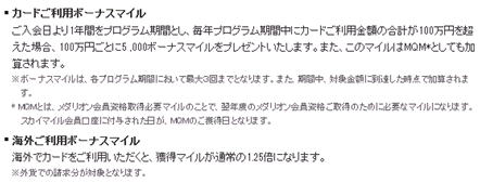 デルタ スカイマイル アメリカン・エキスプレス・ゴールド・カードでは、カード利用金額100万円ごとに、5,000ボーナスマイルがプレゼントされることが記載されていました。
