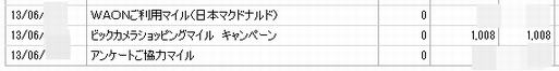 JALマイレージバンクの口座ページです。ビックカメラで買い物をした2日後には、ちゃんと「ビックカメラショッピングマイル キャンペーン」という内容で、1,008マイルが加算されていました。