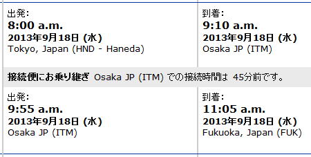 これは、羽田→大阪伊丹→福岡というように、経由するルートになります。片道2区間飛ぶことになりますが、必要マイル数は、直行便と同じ片道6,000マイルになります(これはマイレージプラス独自のルール)。