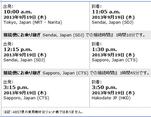 成田→仙台→札幌→函館と、合計3区間も飛ぶルートが出てきました。