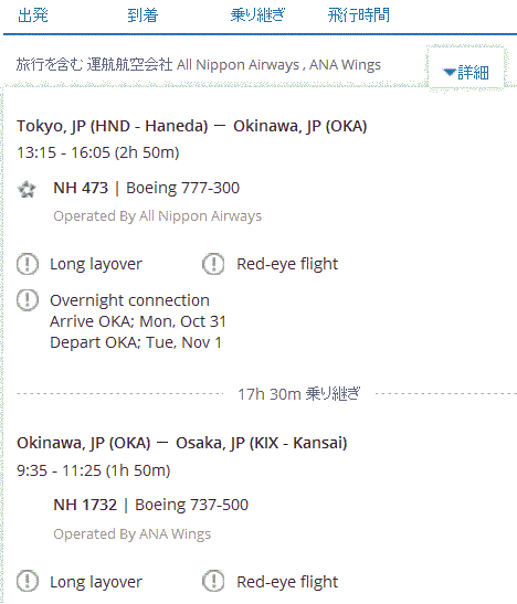 これは、「羽田→沖縄→大阪」という片道特典航空券の検索結果ですが、那覇での乗り継ぎ時間が「17時間30分」になっています。