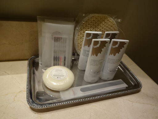 アメニティです。シャンプー、コンディショナー、ボディソープ、ボディーローションの4つがありました。ボディスポンジもありました。