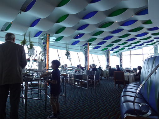 レストラン内部の様子です。窓側のテーブルをリクエストしておきましたが、残念ながら窓側にはなりませんでした。すぐ目の前に、黒い服を着た女性がいますが、私たちも同じように配置されているテーブルにアサインされました。
