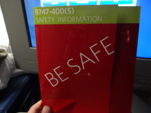 安全のしおりです。ボーイング747−400(ジャンボ機)でした。JALやANAなど、ジャンボ機はどんどん退役になっていますが、デルタ航空も、これから数年かけてジャンボ機を退役させていくようです。残念ですが、燃費のいい新しい飛行機が次々誕生しているので仕方ありません。