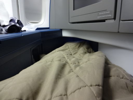 フルフラットの状態で、ブランケットをかけて横になっている様子です。完全にフラットになるだけでも十分なのですが、足元へ行くほど横幅がせまくなるのが少し残念でした。