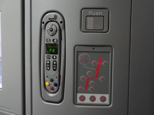 左がエンターテインメントシステム用のリモコン、右側がリクライニング用のボタンです。Pushと書かれたボタンを押すと、モニターが手前に出てきます。
