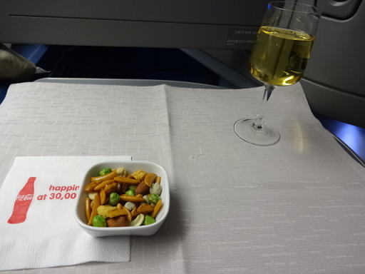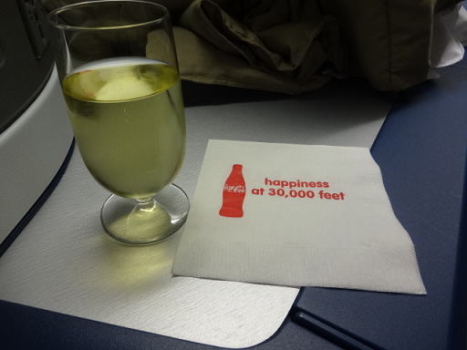 ちなみに、この時のウェルカムドリンクをはじめ、最後まで私の列は日本人の女性乗務員が担当だったのですが、(私の勝手な予想ですが)、この乗務員は日系アメリカ人か、もしくはアメリカ在住が長い日本人で、少し素っ気ない対応でした。