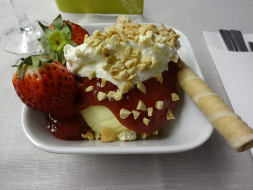 たっぷりのストロベリーソースとホイップクリームがかかったアイスクリームです。おいしかったですが、明らかに高カロリーなので、半分だけ食べました。イチゴは2つとも食べました。