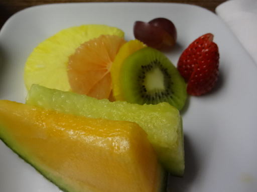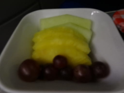 軽食のデザートはカットフルーツでした。1回目の機内食の後のように、トレーでは持ってきませんでした。