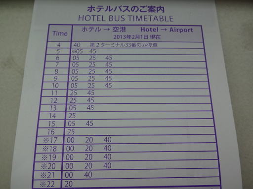 ホテル出発のバス時刻表です。早朝は4時台からの出発なので、格安航空会社の早朝便にも間に合います。