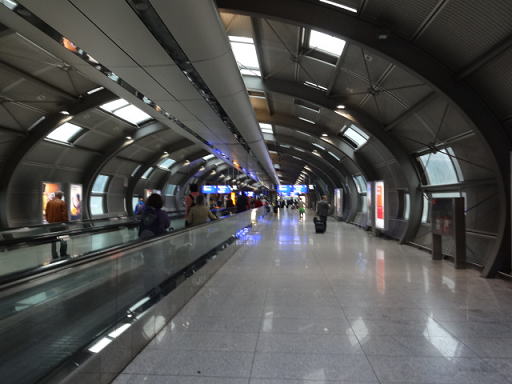 出発フロアから1つ上の階にあがり、このような連絡通路があるので通っていきます。連絡通路はずっと屋内なので、雨でも濡れる心配はありません。