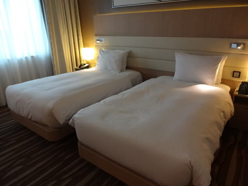 連絡通路を通り、途中右に曲がり、そこから数分歩くと、ヒルトンホテルに着きました。ガラス張りの近代的な空間で、空港ホテルらしいデザインです。