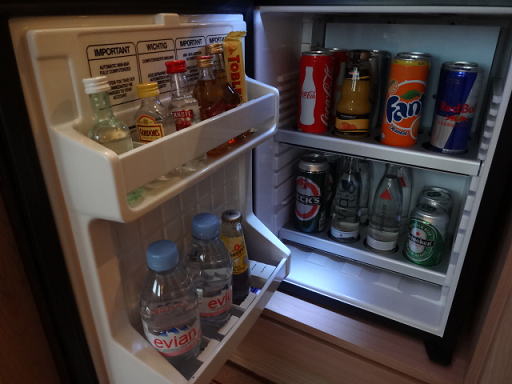 冷蔵庫です。各飲み物が穴の中に入っていて、穴から一旦取り出すと自動的に請求されるシステムなので、少しあいているスペースに自分のものを入れる場合は注意が必要です。