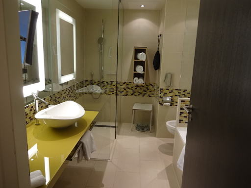 バスルームです。左側が洗面台、正面奥がシャワー、右側にトイレとバスタブです。ちなみに、シャワーの水はけは、今までで一番良かったです。