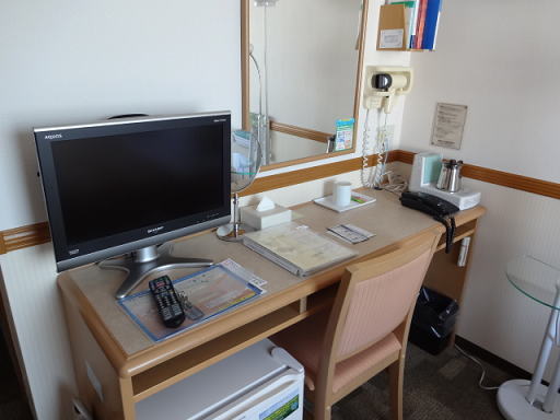 デスク全体です。左にテレビ、右に湯沸かしポットがありました。