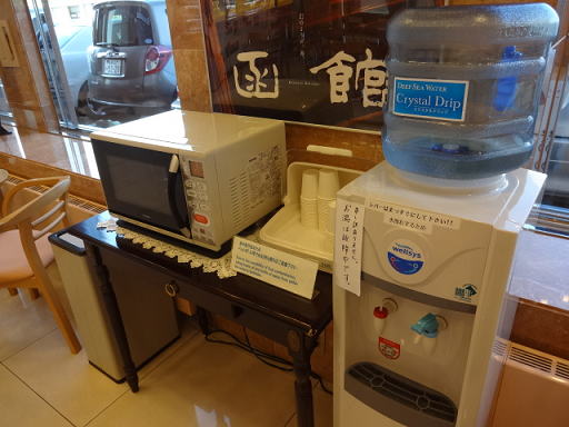 電子レンジ、ウォータータンクのサービスもありました。コンビニなどで買ってきたお弁当などもここで温めることができます。