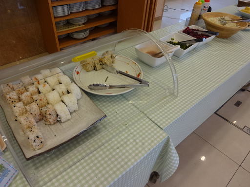 朝食はバイキング形式で、おにぎり、味噌汁、キャベツのサラダなどがありました。豪華な内容ではありませんが、無料なら十分です。