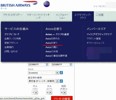 まず、ブリティッシュエアウェイズの公式サイトに行き、ログインします。ログイン後、上のメニューで「エグゼクティブクラブ」の中の、赤線箇所の「Aviosを使う」をクリックします。