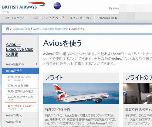 「Aviosを使う」ページです。左側に細かいメニューがあるので、その中から「Aviosを使ってフライトを予約」を選択します。