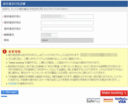 クレジットカード情報、住所を入力した後、「Make booking」をクリックします。