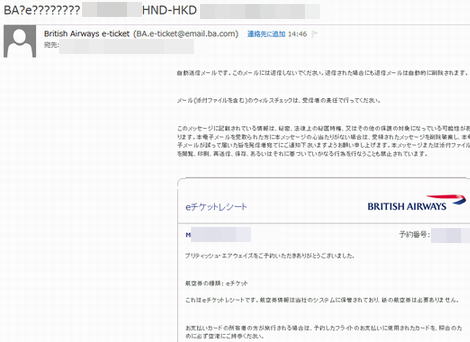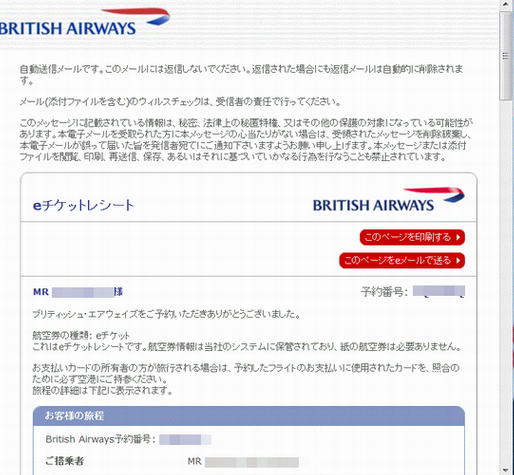 予約完了後、数時間後に、Eメールに予約完了を知らせるメールが届きました。タイトルは「BA?e???????」の後に、予約番号・飛行期間・日付・出発時間が表示されていました。