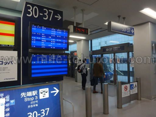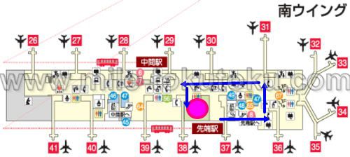 | 保安検査・出国審査後 南ウィング 37番ゲート付近 先端駅 行きの シャトルを利用 |