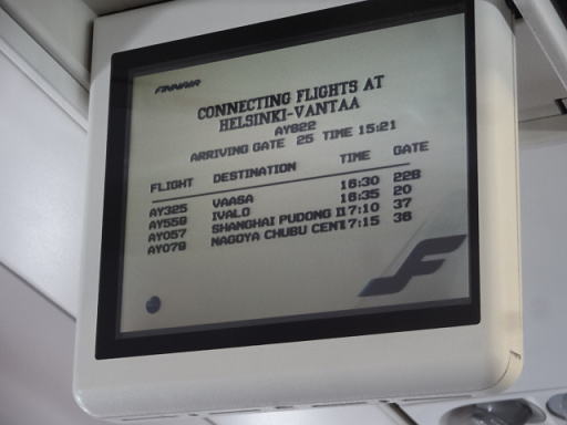 ヨーロッパ各地からヘルシンキへ向かう便では、ヘルシンキ到着が近づくと、乗り継ぎ便の情報が表示されます。