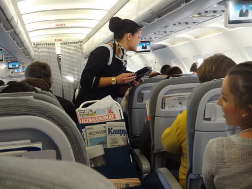 フィンランド航空は、おそらく世界各地から、ヘルシンキを経由してヨーロッパ各地へ乗り継ぐ客が多いと思われるので、その分、たくさんの人が、多くの機内持ち込み手荷物を持っている感じでした。