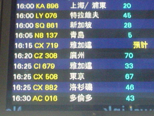 出発便の案内掲示板です。中国語なので東京や青島はもちろん、日本語ではカタカナで表記される地名も全て漢字で書かれていました。日本語ではカタカナを使う地名も、漢字で表記すると結構面白いものです。