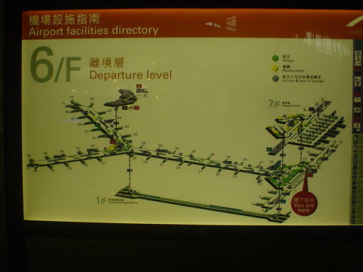 香港国際空港ターミナルの地図です。右下にある赤い丸が、この写真を撮った場所です。ターミナルの形は、アルファベッドのYを横にした感じになっています。