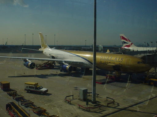 この飛行機、機体の前半分が派手な金色で塗装されていますが、どの航空会社かわかりますでしょうか。この航空会社はガルフ航空で、中東のバーレーンを拠点にしています。
