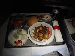 ビーフの串焼きを選んだ私の機内食です。右下がメインのビーフ、左下が前菜の春巻き、左上がサラダ、右上がデザートです。