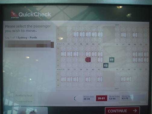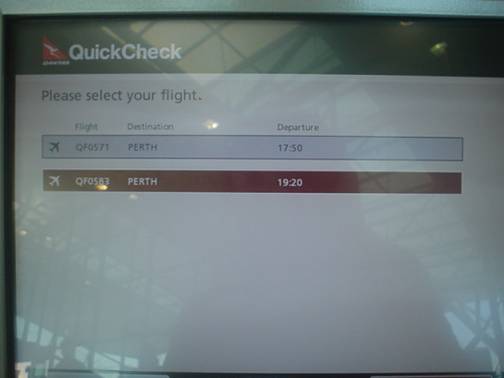 カンタス航空の国内線では、このような自動チェックイン機でチェックインを行います。預ける荷物がない場合はそのまま搭乗口へ、ある場合は荷物預けカウンターで荷物を預けます。