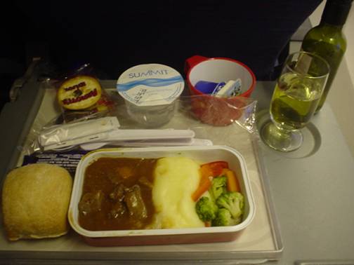 国内線とはいえ、このような軽い機内食が出されました。メニュはビーフシチュー&マッシュポテトの野菜添えとパンです。質素ですが、無料ですからそれだけでも感謝です。