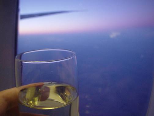 機内食だけでなく、うれしいことにアルコール類も全て無料です。なので、美しい日の入りを満喫しながらおいしい白ワインを飲みました。