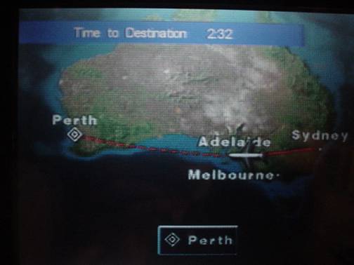 フライトマップの画面です。このように、アデレード上空を通過してパースへ向かっていきました。アデレードはもっと南にあるかと思っていたのですが、シドニーの左にありました。