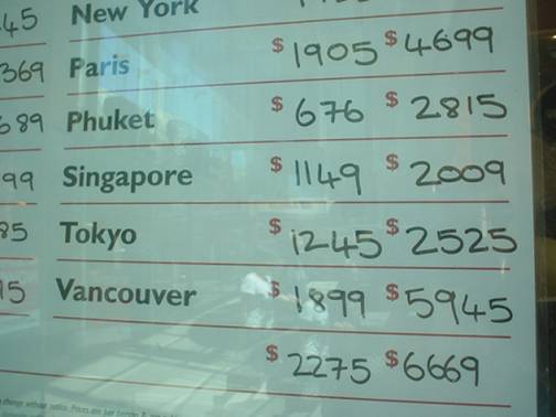旅行代理店の料金案内です。東京へは往復で1245ドルとなっていました。カンタス航空の直行便かシンガポール航空などの経由便かは記載されていませんでしたが、やはり日本発の格安航空券が激安なのは明らかです。