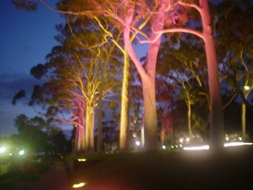 並木道に並んでいた木々も、夜にはこのように違う色でライトアップされ、とても神秘的なムードが漂っていました。