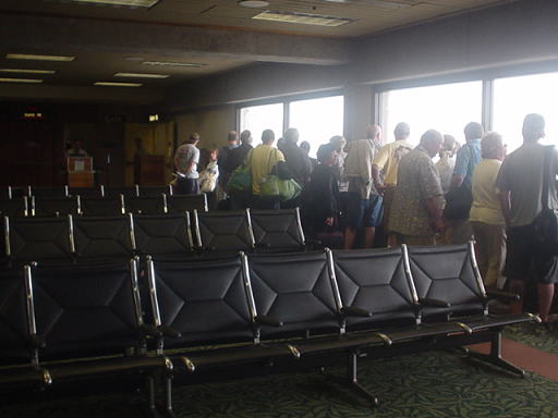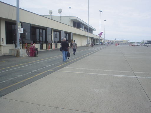 このように、ターミナル内までは外を歩いていきます。奥にはハワイアン航空の飛行機が見えました。係員もちゃんと監視してなかったので、このまま滑走路へ走ることもできたかもしれません(笑)。
