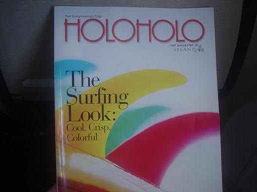 アイランドエアーの機内雑誌です。タイトルは「Holoholo」でした。このHoloholoとは、ハワイ語で「散歩に行く」などの意味があるようです。