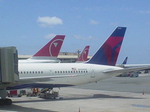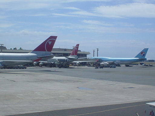 反対側には、ノースウエスト航空、大韓航空などの飛行機がありました。ハワイへの観光需要が多いためでしょうか、ジャンボ機が目立ちました。