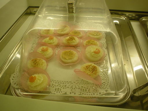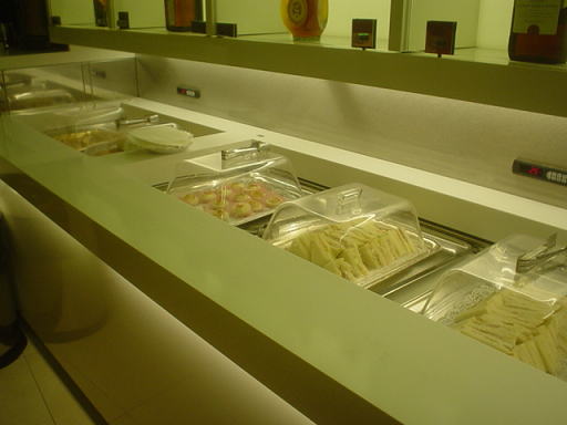 このように、3〜4種類の軽食が用意されていました。場所はラウンジ中心の有人バーのすぐ隣です。