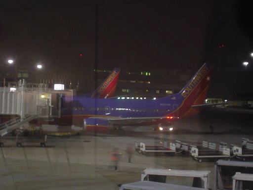 外を見てみると、サウスウエスト航空の飛行機がありました。昔は黄土色っぽい機体でしたが、現在はすべて、この青っぽい機体になっているようです。