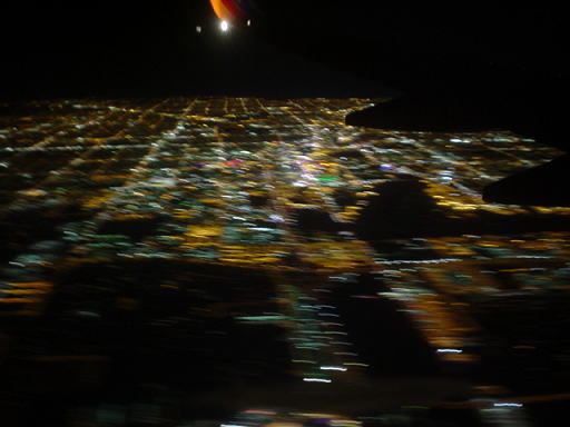 すると急に、暗闇の中に、このように大きな明りの固まりが姿を現しました。ラスベガスは砂漠の中に作られた町というのは聞いていましたが、それを実感できる光景です。こんなに四角になっている明りを見たのは、今回が初めてだと思います。