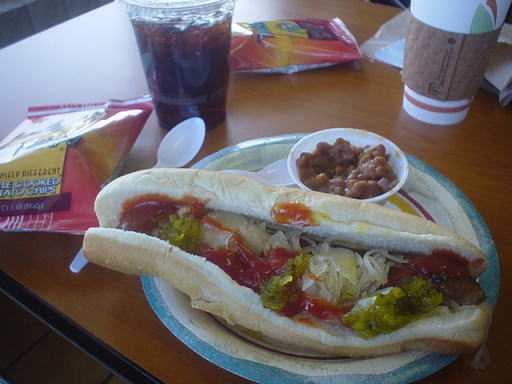 私は大好きなホットドッグを選びました。アメリカでは、ケチャップや玉ねぎなどがかけ放題なのがうれしいです。